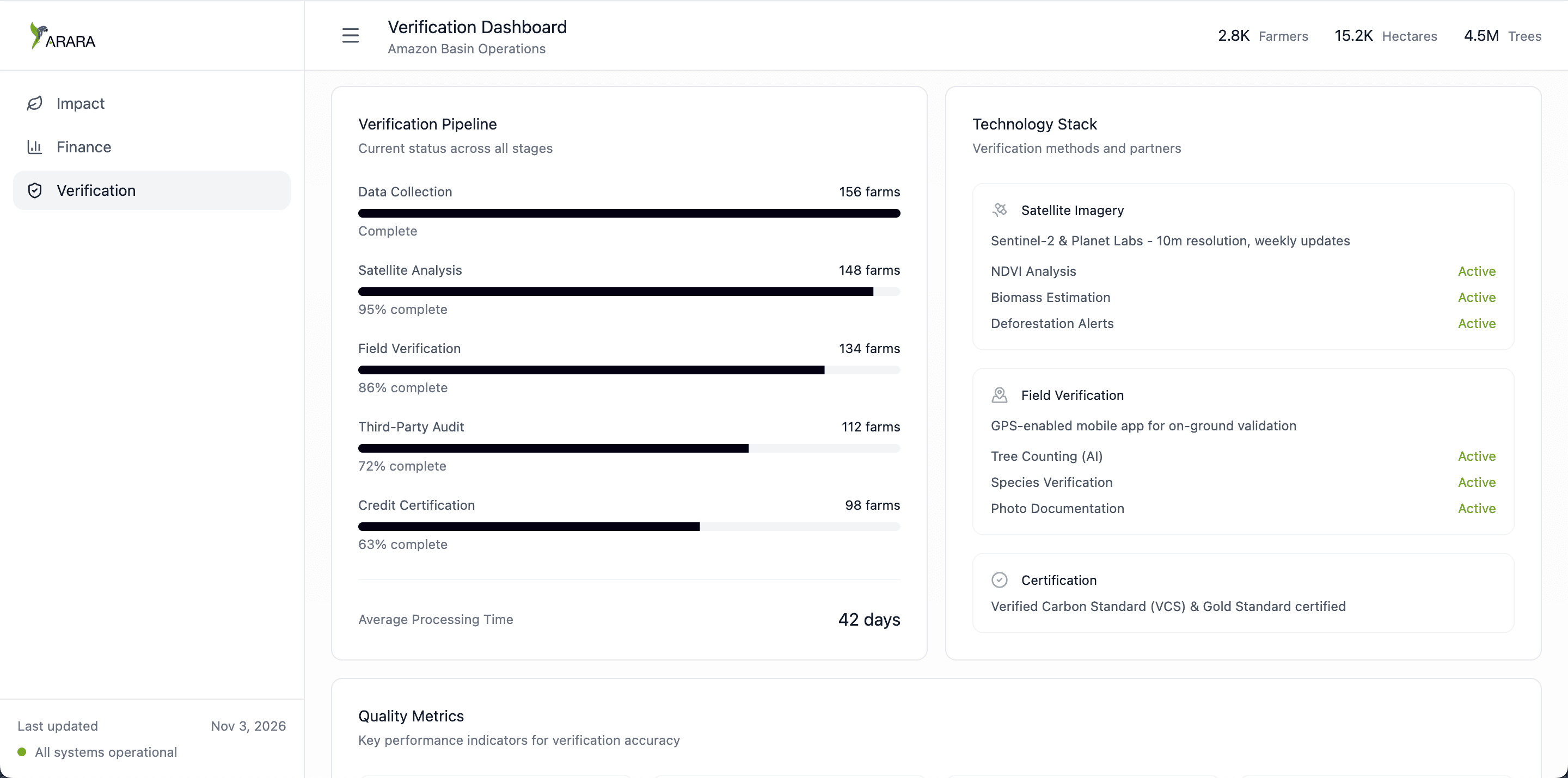 Solution: Five-stage pipeline with real-time completion rates showing satellite analysis (95%), field verification (86%), third-party audits (72%), and certification (63%).