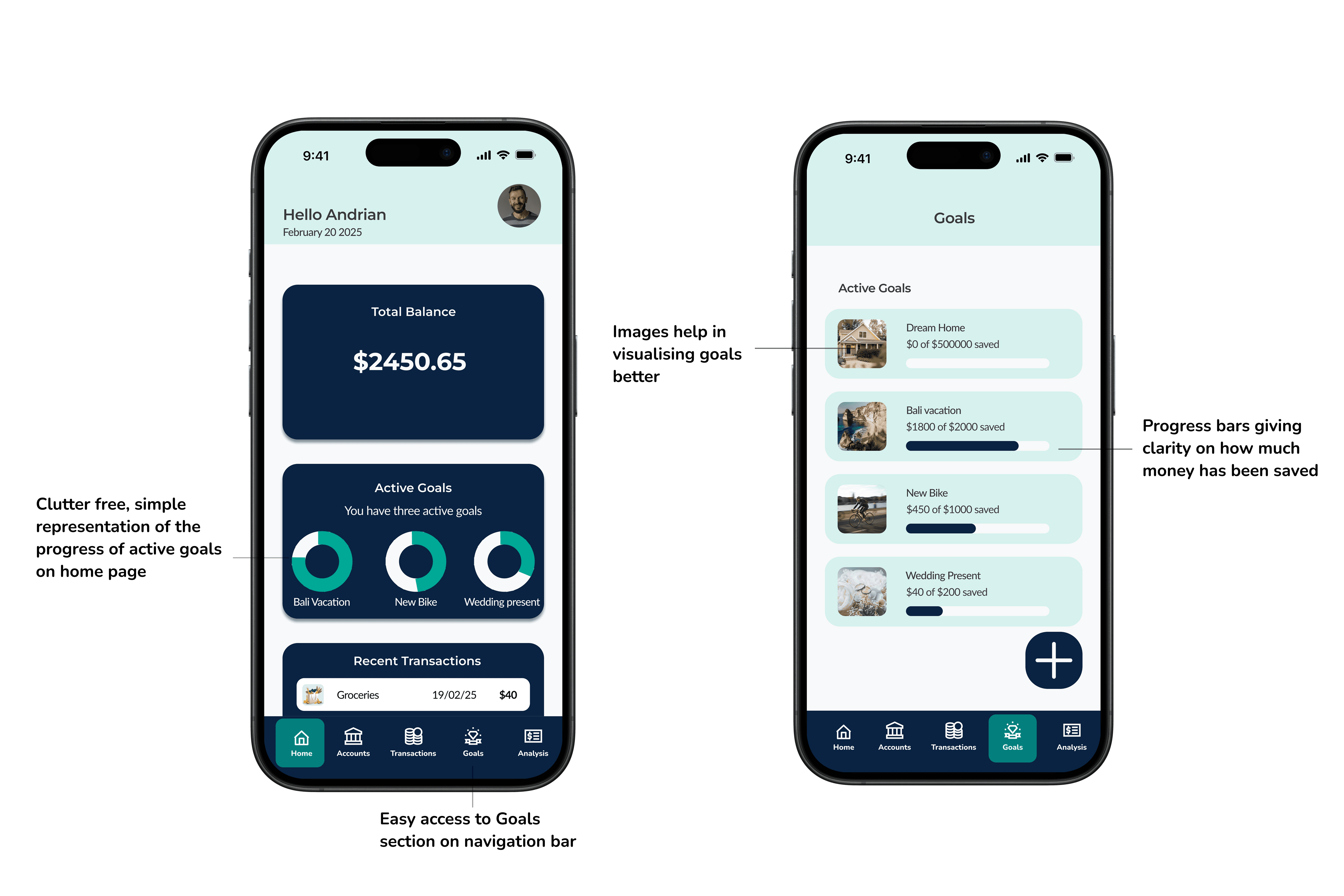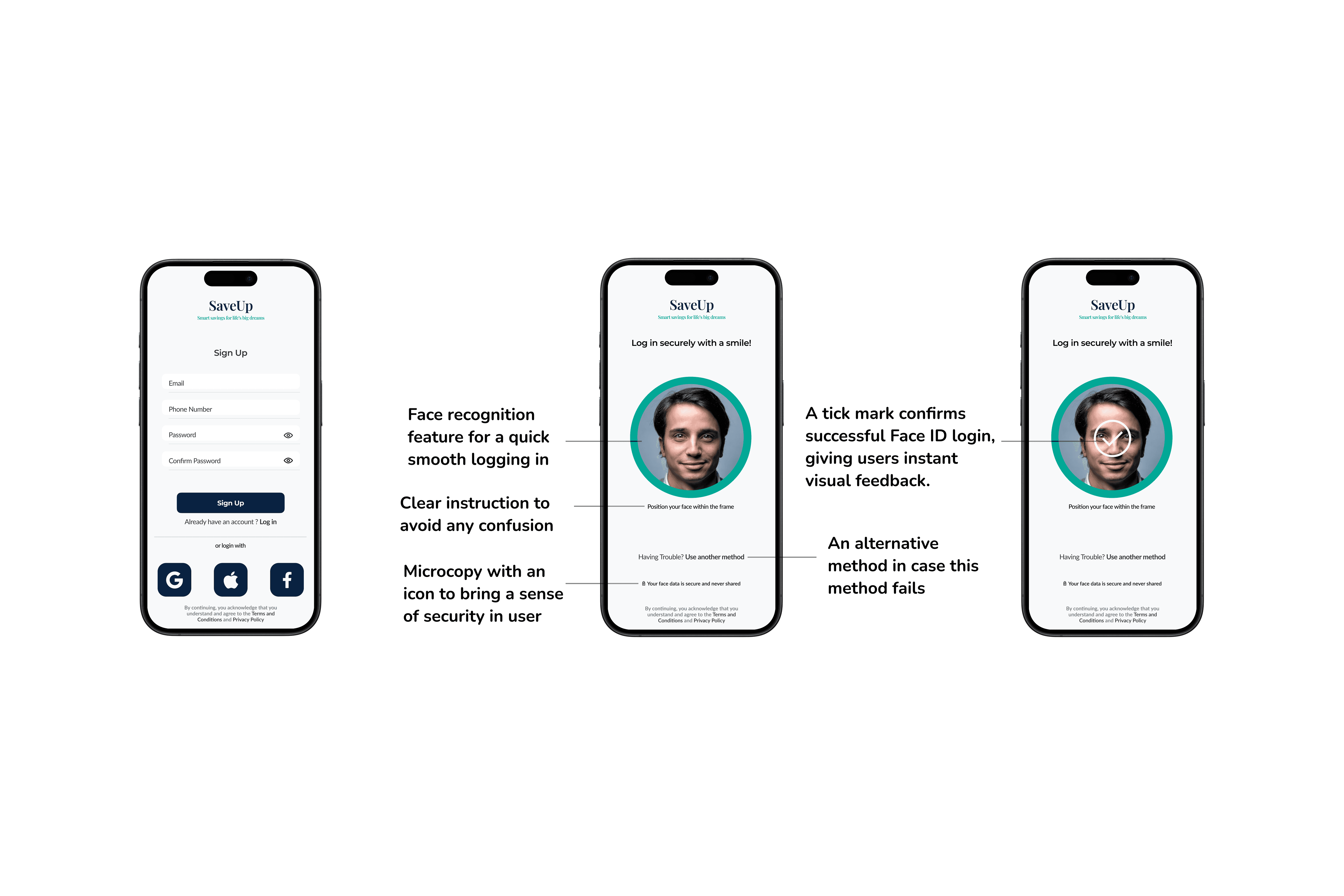 User testing showed a 35% engagement jump, driven by seamless face login, bite-sized savings goals, and visualisation tools (e.g., custom goal images). Combined with automatic transaction tracking and cash-expense logging, the app balances simplicity with holistic financial oversight to sustain user commitment.