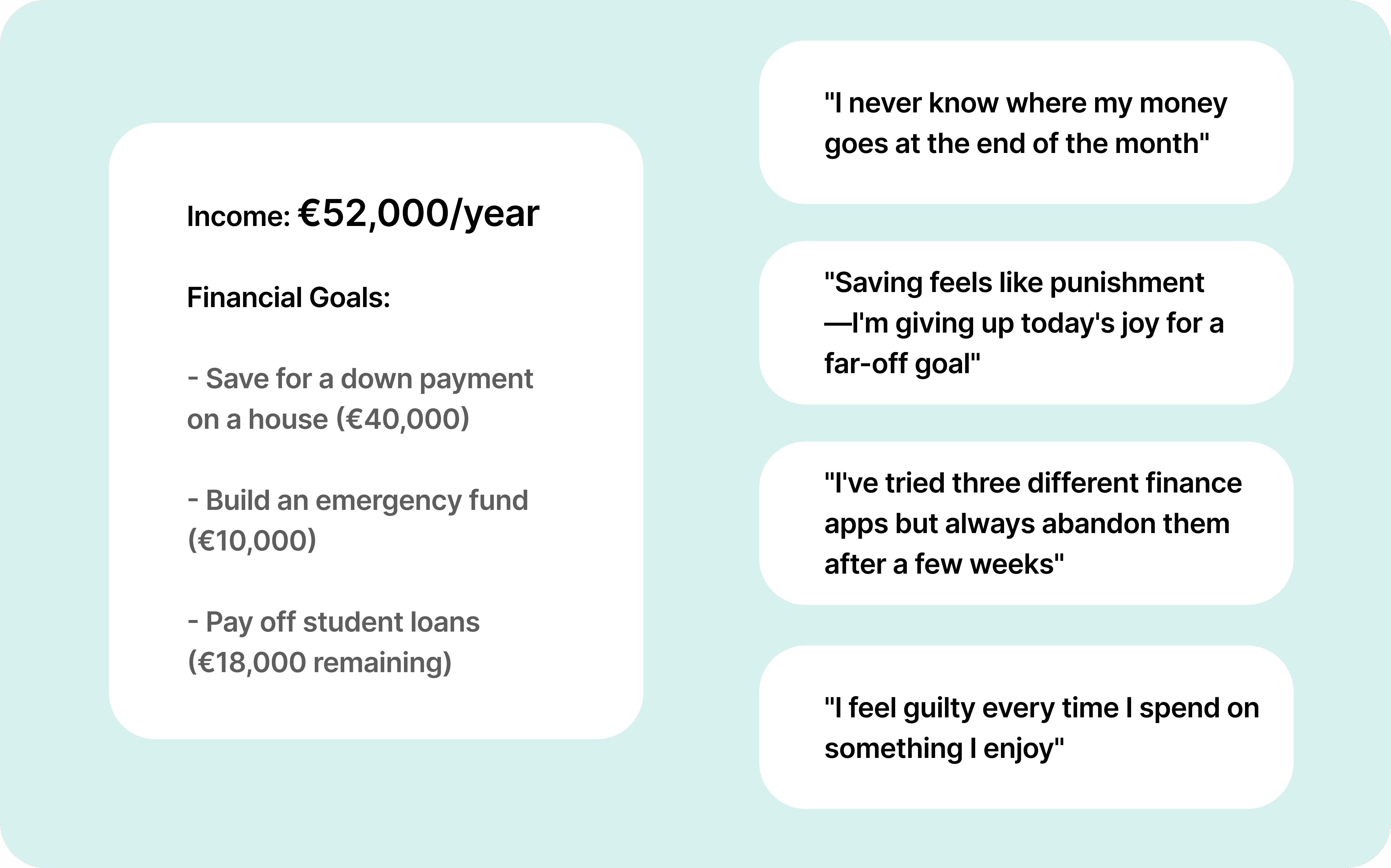 Emma represents our primary user—someone with financial goals and adequate income, but struggling with consistency and emotional connection to their savings journey.